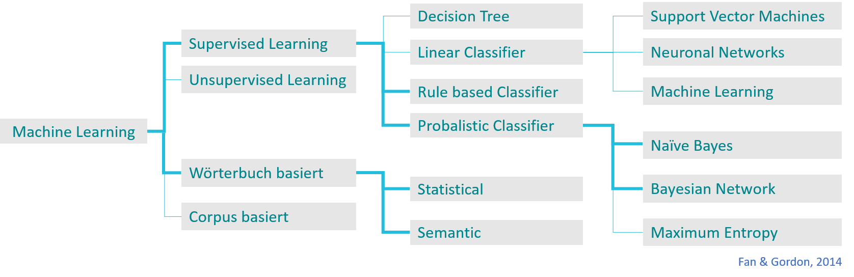 In dieser (siehe Titelbild) komprimierten Entscheidungsbaum-Darstellung der eingesetzten Machine Learing Methoden, sind die am Häufigsten der Sentiment Analyse eingesetzte fett markiert.